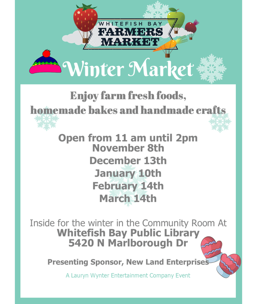 Thanks to the Whitefish Bay Public Library, the Winter Market is indoors in the library’s 2nd floor community room. Stay warm and cozy this winter while you shop local. As always the WFB Farmers’ Market brings high quality foods from farm to table with the best prices. Find fresh meats, cheese, honey, winter produce, home baked goods and other delicious bites. Make sure to stop by our monthly makers and other local businesses who are ready to serve you.